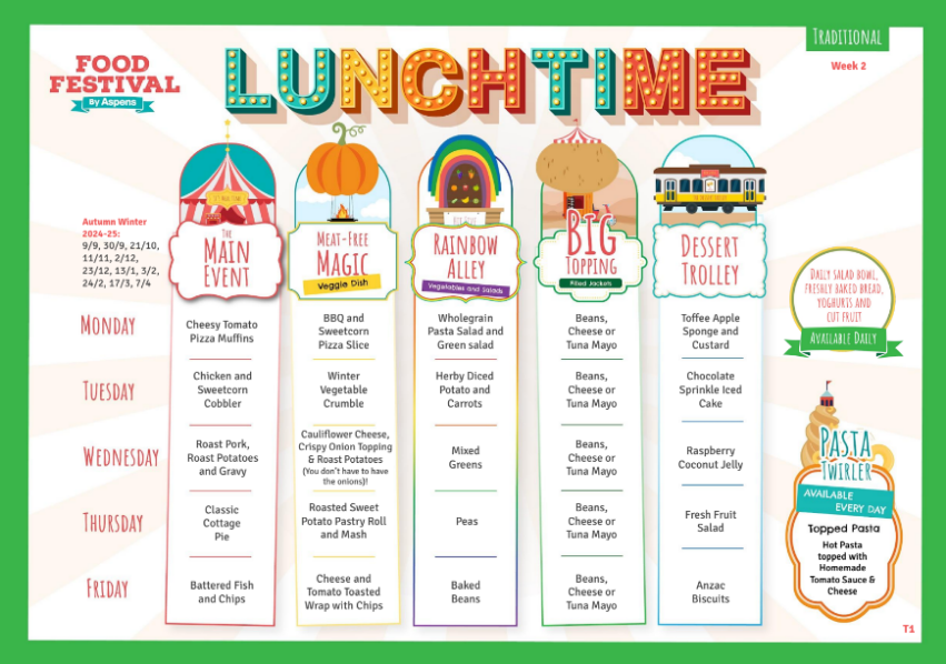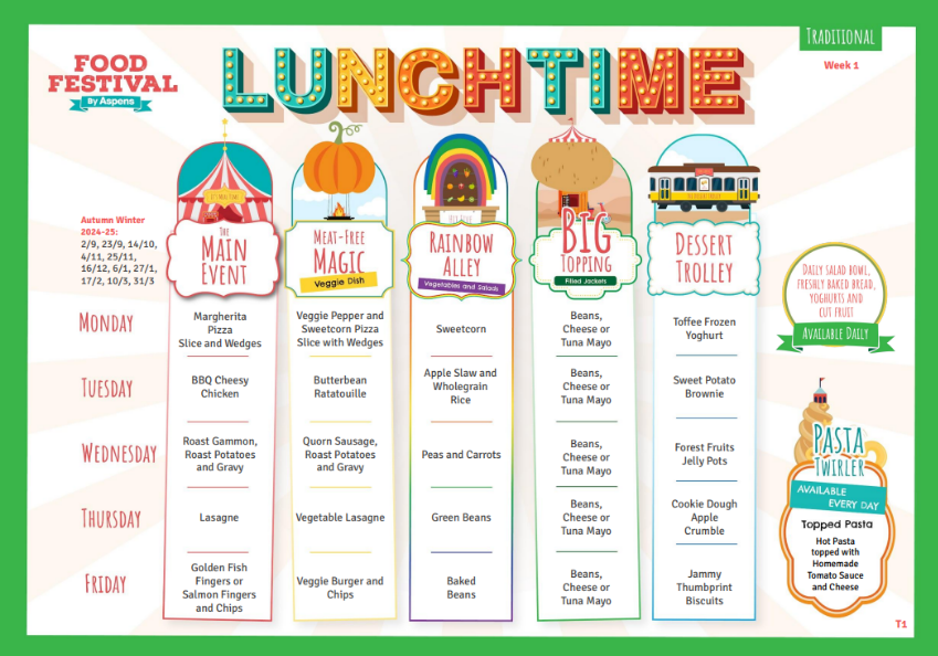 Meals are ordered via Aspens Select, which is an online payment system that allows you to order in advance and any time up to 9am on the day for a meal. Registration codes are provided by the office, and you can then register with Aspens here